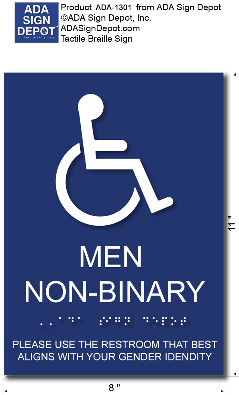 The ADA-1301 Restroom sign has tactile text (letters raised 1/32" for touch-reading) and Braille that reads: MEN NON-BINARY. Below that is a printed (non-tactile) message: PLEASE USE THE RESTROOM THAT BEST ALIGNS WITH YOUR GENDER IDENTITY.